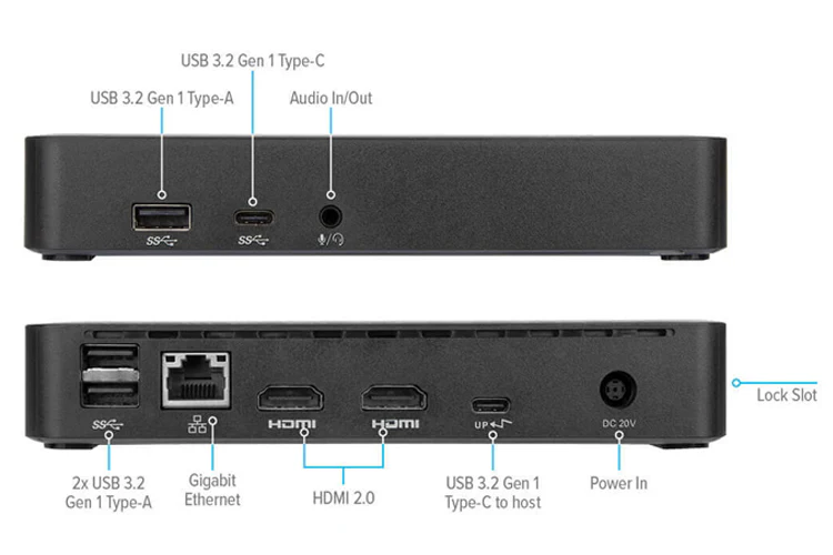 Disfruta de vídeos 4K nítidos y claros mientras admites una conexión de hasta dos monitores. Con dos puertos HDMI 2.0, puede admitir dos monitores (3840x2160 p60). Además, conecta todos tus accesorios favoritos con una combinación de USB-A (3 puertos USB 3.2 Gen 1 Tipo-A) y USB-C (1 puerto 3.2 Gen 1 Tipo-C), además de puertos Ethernet y de audio.