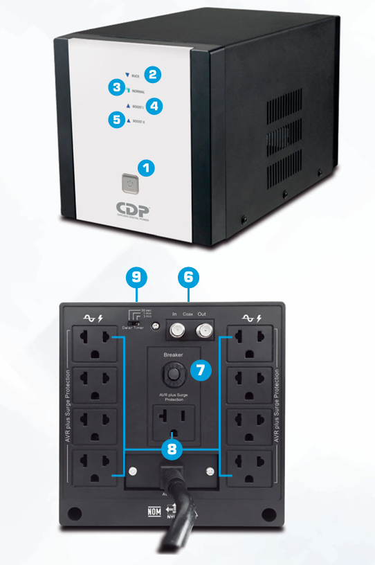 8. 8 Salidas NEMA5-15R y 1 Salida NEMA5-20R reguladas y con supresión