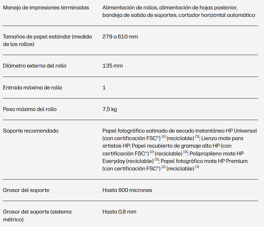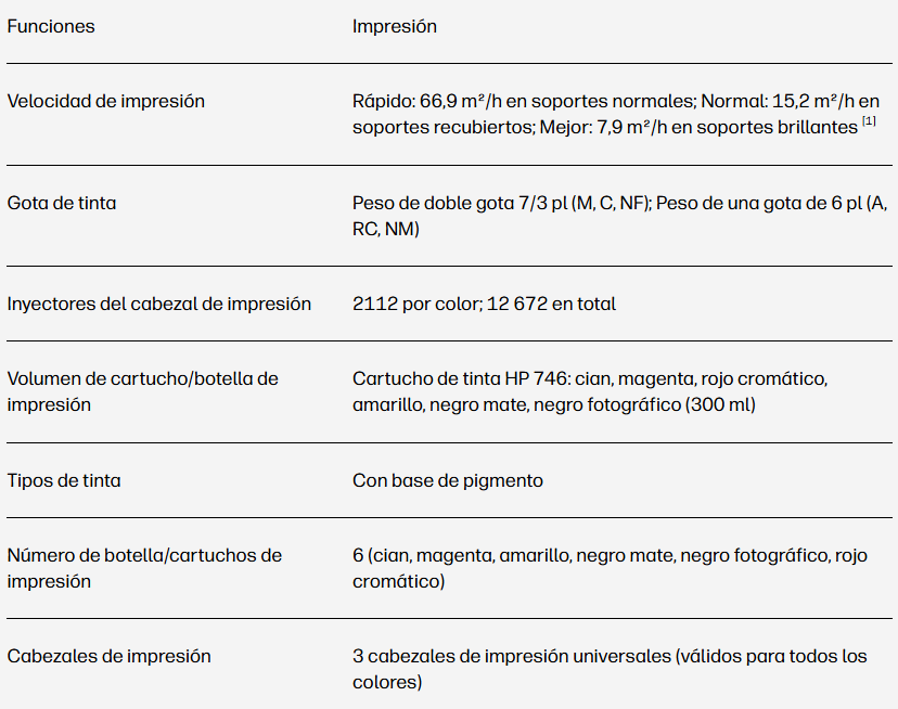 - Velocidad de impresión: Rápido: 66,9 m²/h en soportes normales; Normal: 15,2 m²/h en soportes recubiertos; Mejor: 7,9 m²/h en soportes brillantes