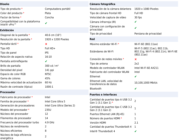 Establece una nueva base en durabilidad, portabilidad y funciones con tecnología de IA que garantizan una productividad esencial y seguridad confiable para los usuarios. DELL Pro PC16250. Tipo de producto: Computadora portátil, Factor de forma: Concha. Familia de procesador: Intel Core Ultra 5, Modelo del procesador: 235U. Diagonal de la pantalla: 40.6 cm (16"), Tipo HD: Full HD+, Resolución de la pantalla: 1920 x 1200 Pixeles. Memoria interna: 16 GB, Tipo de memoria interna: DDR5-SDRAM. Capacidad total de almacenaje: 512 GB, Unidad de almacenamiento: SSD. Modelo de gráficos en tarjeta: Intel Graphics. Sistema operativo instalado: Windows 11 Pro. Color del producto: Plata. Peso: 1.92 kg