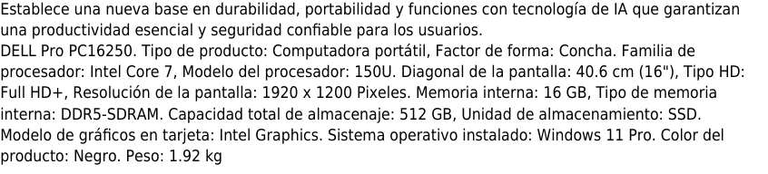 LAPTOP DELL PRO PC16250 16" ICORE 7 150U, 16GB, 512GB, WIN11PRO