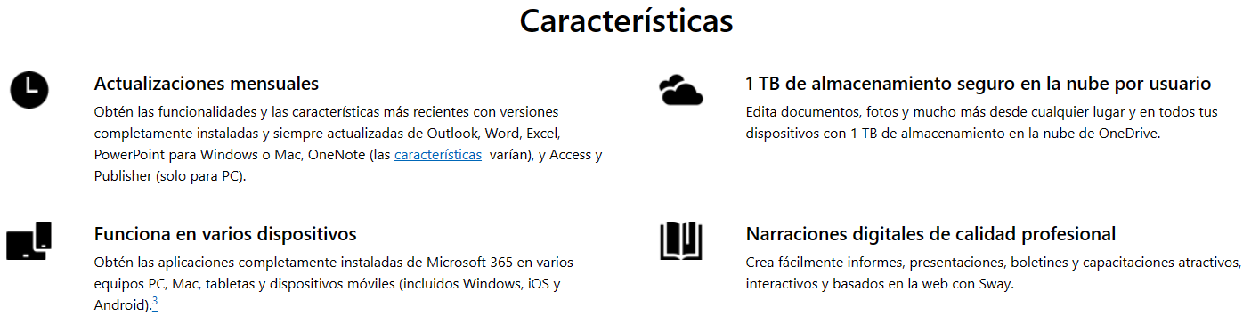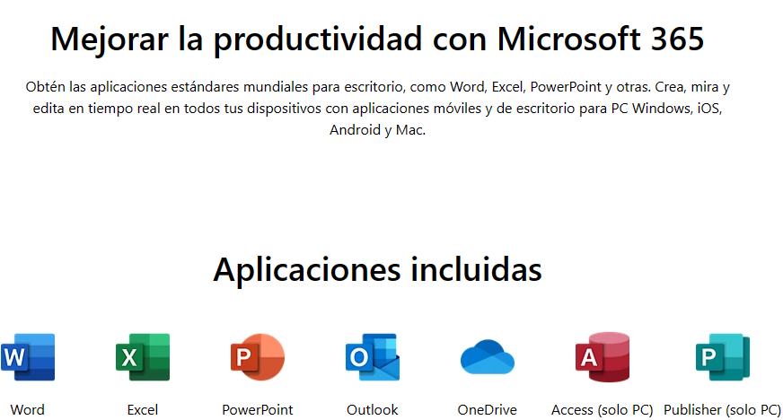 - Obtén las versiones de escritorio de aplicaciones de Microsoft 365: Outlook, Word, Excel, PowerPoint, OneNote (además de Access y Publisher para PC únicamente).