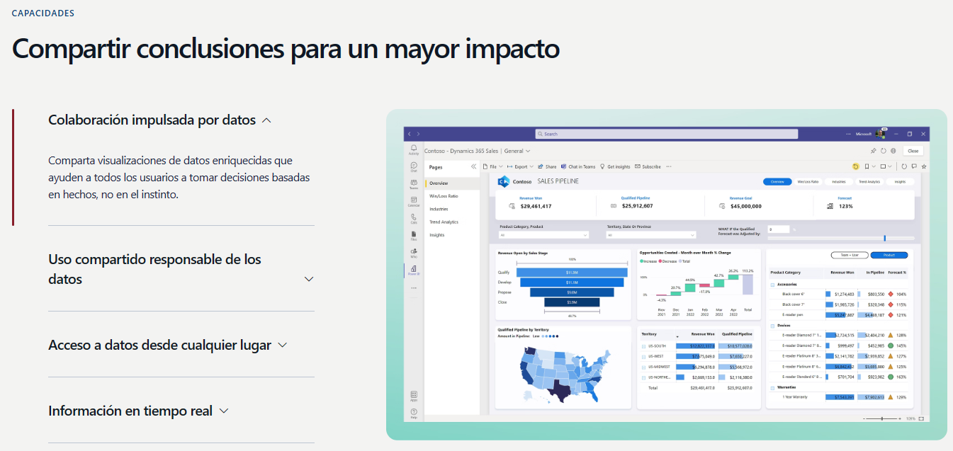 Power BI Pro también ofrece una variedad de opciones de visualización, permitiendo a los clientes presentar datos de la manera que mejor se adapte a sus necesidades. Los clientes pueden crear informes y tablas dinámicos e interactivos, visualizaciones geográficas, gráficos y más.