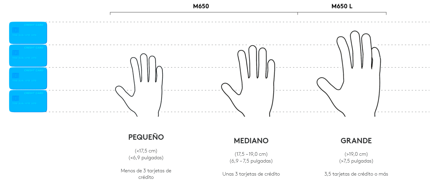 Elige el modelo Signature M650 más adecuado para ti. Recomendamos el M650 para manos pequeñas y medianas, el M650 L para manos grandes y el M650 L Left para usuarios zurdos. ¿No sabes qué mouse es el más adecuado para ti? Consulta nuestra guía de tamaños a continuación.