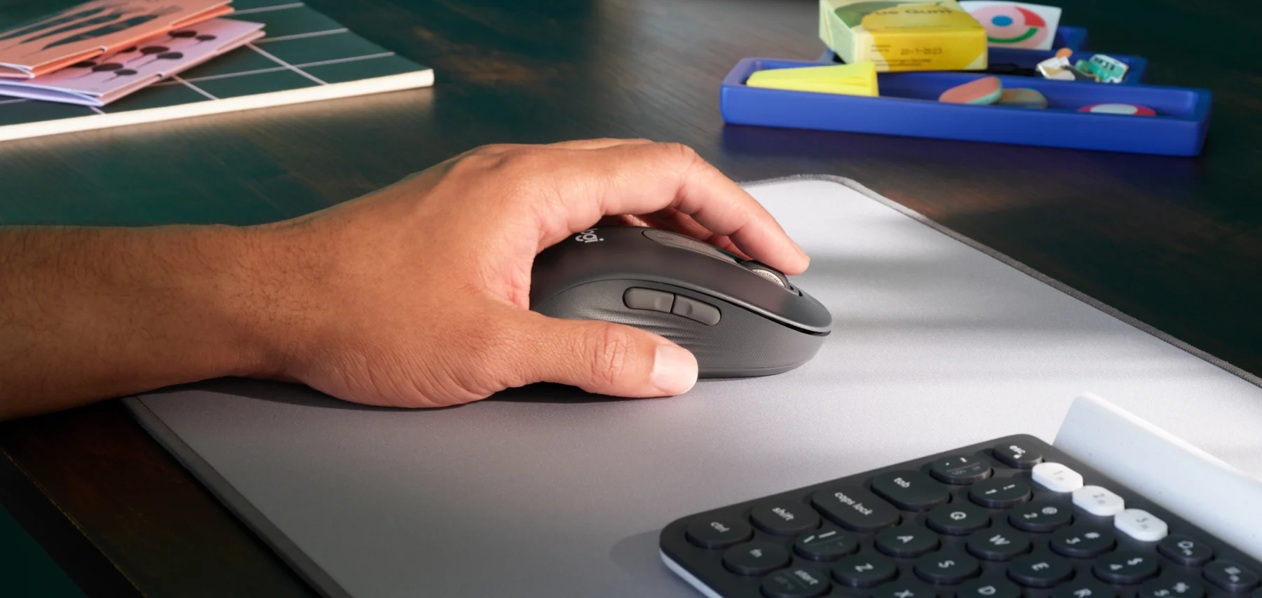 Disfrutarás trabajando con tu Signature M650. Gracias a la forma contorneada, un área suave para el pulgar y laterales de goma en cada mouse, la mano se mantiene cómodamente en su sitio. Obtén más confort y concéntrate más en lo que tienes que hacer.