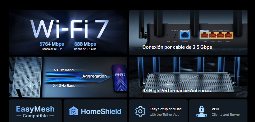 - WiFi 7 de doble banda de 6,5 Gbps: Permite que tus dispositivos funcionen a toda velocidad. Disfruta de una transmisión fluida en 4K/8K, juegos inmersivos de AR/VR y descargas ultrarrápidas.
