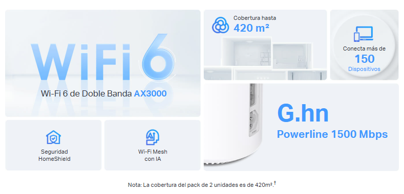 - Combina Wi-Fi Mesh y PLC G.hn. Alcanza una velocidad de hasta 3 Gbps combinando ambas tecnologías.