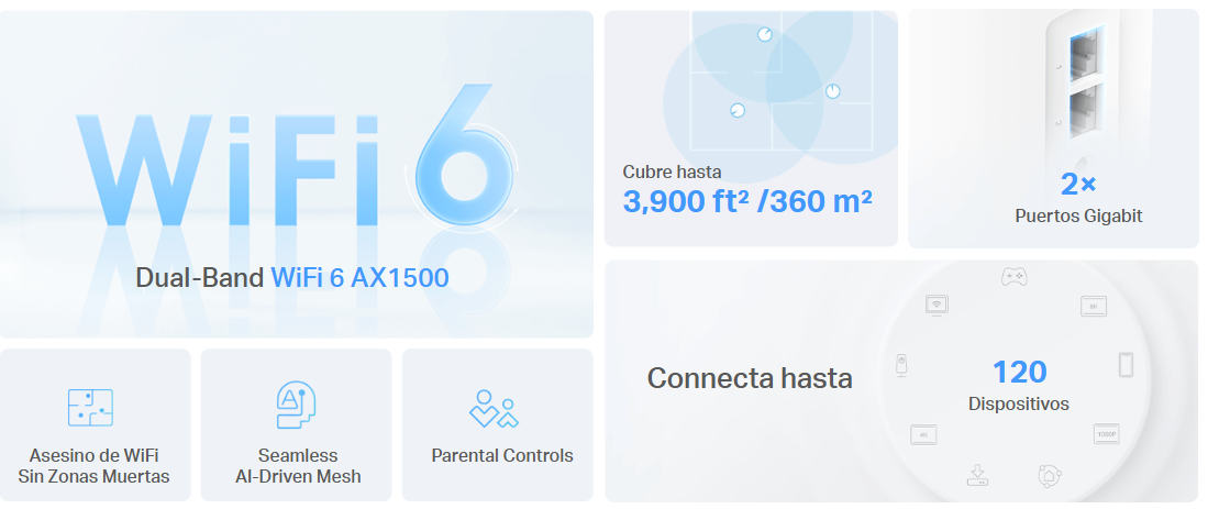 - Conexiones más rápidas: Velocidades de Wi-Fi 6 de hasta 1500 Mbps: 1201 Mbps en 5 GHz y 300 Mbps en 2,4 GHz.