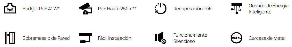 - Hasta 250 m de transimisión PoE. Con el modo Extend, la distancia de transmisión PoE alcanza hasta 250 m, perfecto para el despliegue de cámaras de vigilancia en grandes áreas.**