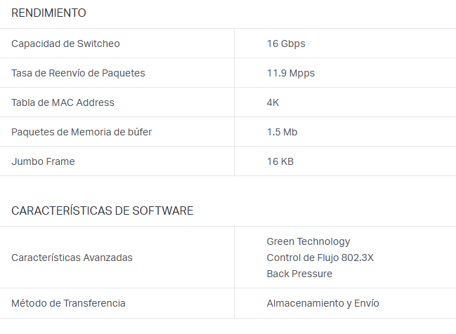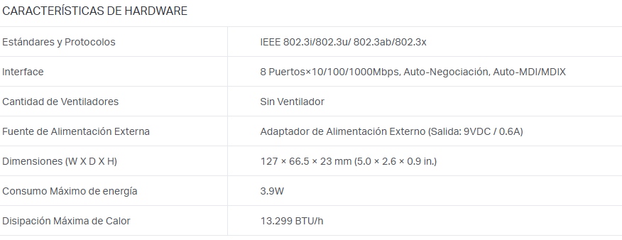 - 8 Puertos RJ45 10/100/1000Mbos con Auto Negociación, soporte Auto-MDI/MDIX