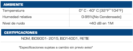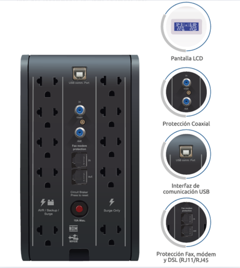 Los modelos de mayor capacidad en torre ofrecen una pantalla LCD avanzada que es interactiva e ilustra funciones como niveles de batería, % de carga, % de batería, voltaje de entrada, voltaje de salida, Hz. Las interfaces web permiten el monitoreo local y remoto. Las alarmas audibles indican el funcionamiento y los niveles de batería. Certificado por las agencias reguladoras NOM, ISO9001-2015, ISO14001, RETIE.