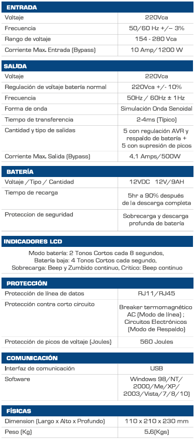 5 salidas con respaldo de batería y supresión de picos. 5 salidas con supresión de picos.